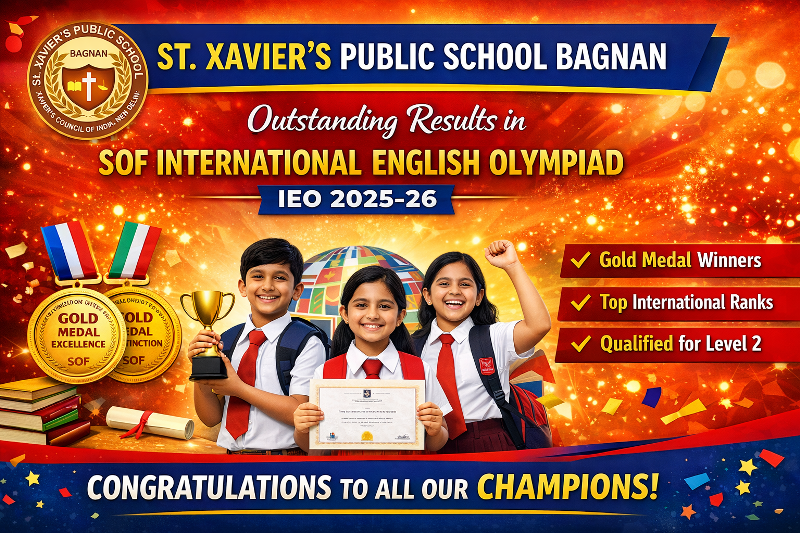 SOF International English Olympiad Result 2025–26 | St. Xavier’s Public School, Bagnan St. Xavier’s Public School, Bagnan (Howrah, West Bengal) proudly announces the excellent results of the SOF International English Olympiad (IEO) 2025–26, conducted by the Science Olympiad Foundation (SOF). With the participation of 117 students from Classes I to VIII, our students delivered outstanding performances at International, Zonal, and School Levels, bringing laurels to the institution. 🏅 SOF IEO 2025–26 Highlights 🥇 Gold Medals of Distinction for exceptional international performance 🥇 Gold Medals of Excellence across multiple classes 📜 Participation Certificates & Student Progress Reports (SPR) awarded to all [...]